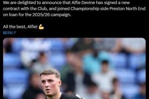 体育资讯8月8日讯 热刺官方宣布与戴文续约,并将其外租。热刺官方写道:“我们很高兴地宣布,戴文已经与俱乐部签下新合同,并将在25/26赛季外租至英冠球队普雷斯顿。”戴文现年21岁,司职中场,上赛季被外租至韦斯特鲁,出场32次,贡献6球1助攻。